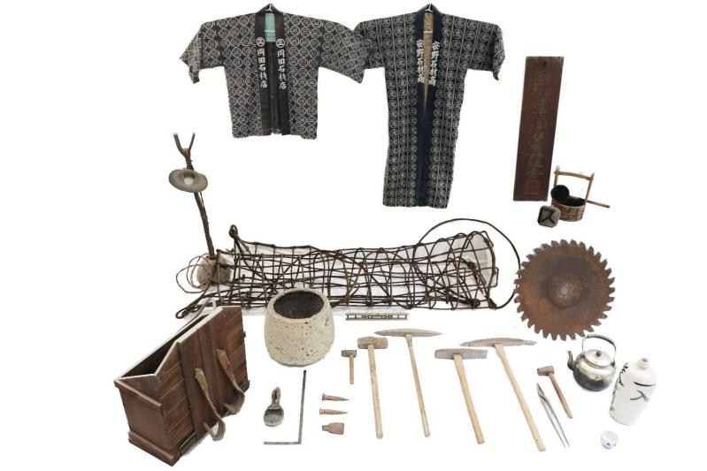 軟石系の大谷石は硬石系の石工用具と比べて簡便で小ぶりな用具が多い。地下坑内掘りに使用されたツルハシ類の採掘用具をはじめ、切り出した石の運搬用具や修理用の鍛冶道具、問屋が管理した販売関係の資料から構成されている。