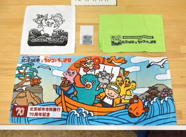 いずれも市の公式キャラクター「あんちゃん」「こうちゃん」と主人公のちびゴジラが描かれている。このうち、フェースタオルはJR磯原駅自由通路に設置されている巨大な大漁旗と同デザインで、市の鳥や花、木のほか六角堂などもあしらわれている。
