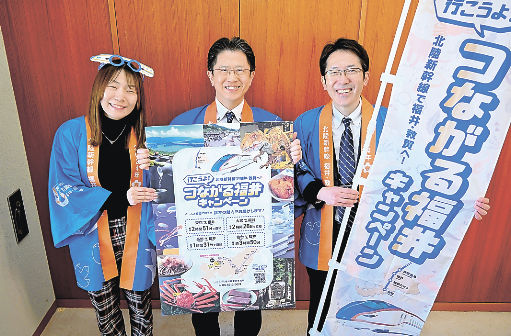 北陸新幹線でアクセスしやすくなった福井県をPRしようと、福井県東京事務所の萩原雅広所長らが上毛新聞社を訪れ、高崎市で29日に始まる物産イベント「つながる福井フェア」や、注目の観光スポットを紹介した。