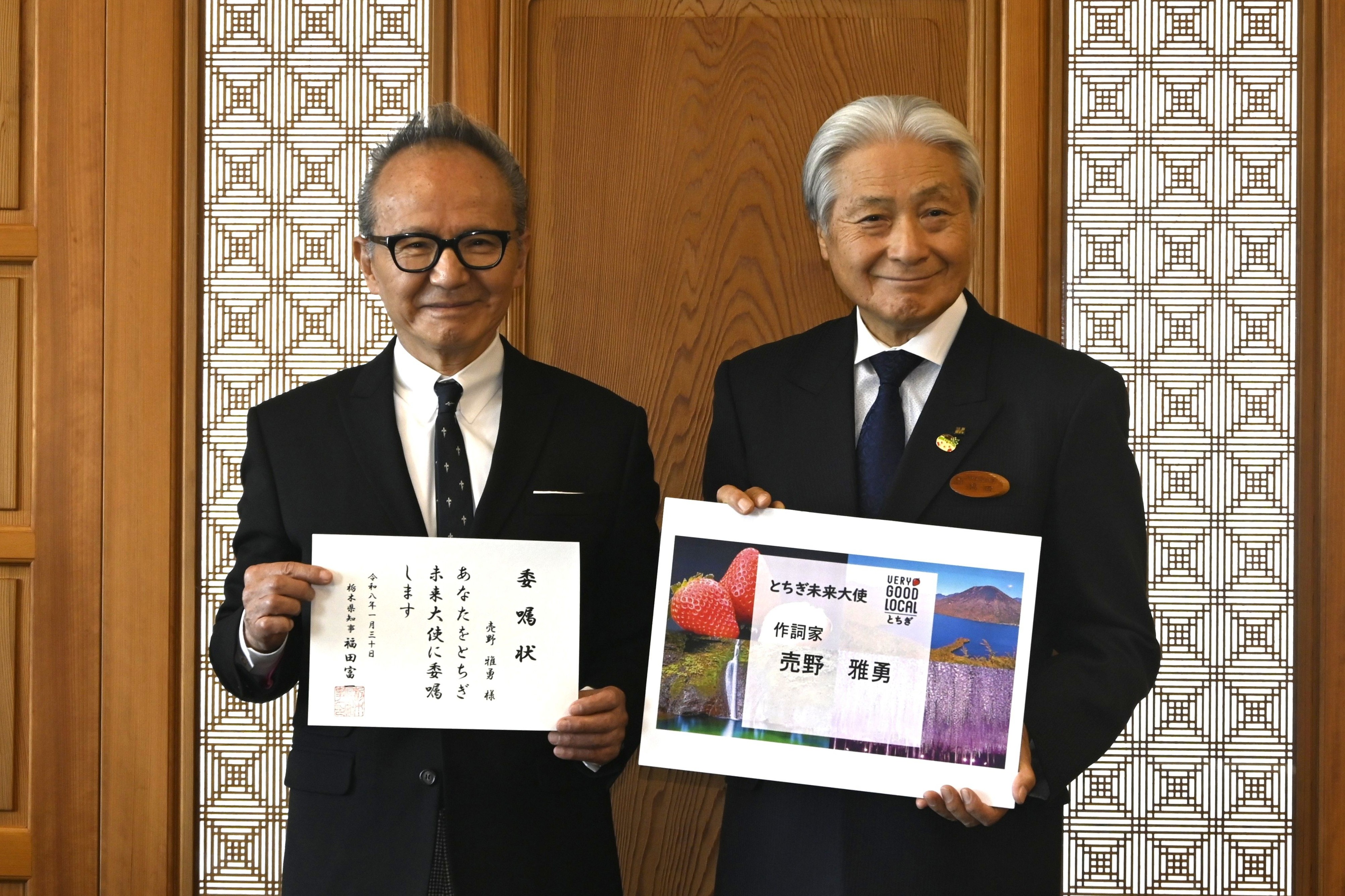1980年代から数々のヒット曲を手がけた栃木県足利市出身の作詞家、売野雅勇さん(74)が30日、県の魅力を発信する「とちぎ未来大使」に任命された。県東京事務所で福田富一知事が委嘱状を手渡した。