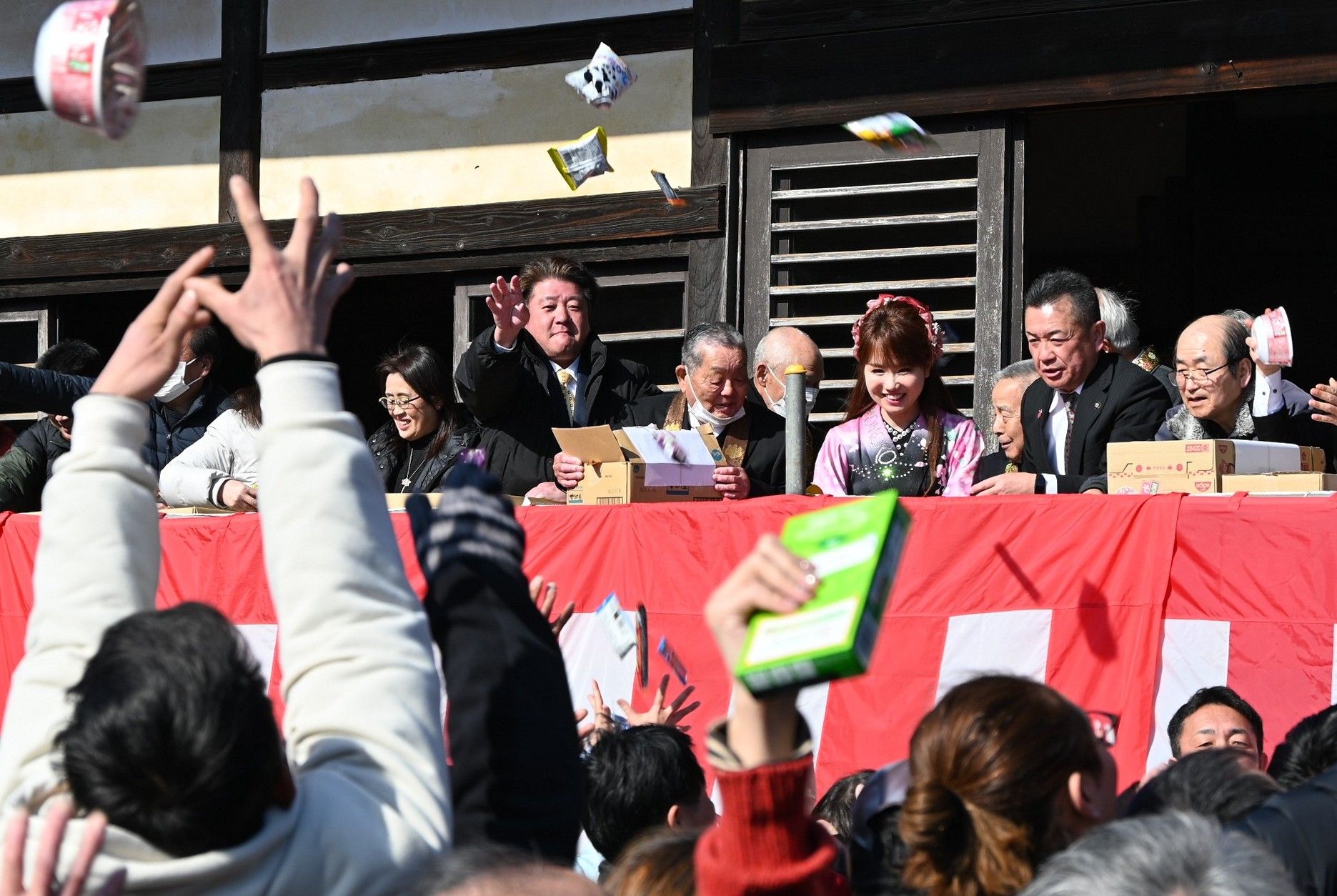 大沢さんをはじめ、法要に参列した来賓や檀家らが講堂の縁側に並び、持参した菓子やカップ麺、果物などを「福は内」のかけ声に合わせて次々にまいた。境内に詰めかけた人たちは、懸命に手を伸ばし「福」をつかみ取っていた。