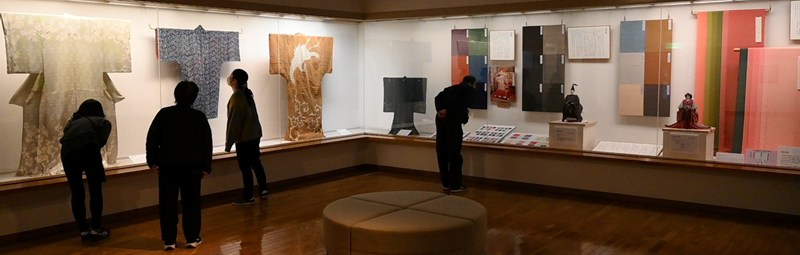 群馬県高崎市染料植物園の収蔵品展「草木染の美 冬」が23日まで、同園の染色工芸館で開かれている。干支(えと)の午(うま)にちなみ馬毛などを用いたタペストリーや吉祥文様の着物といった染色品約30点を展示している。