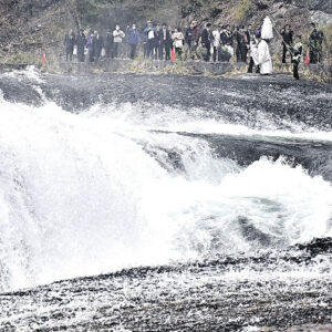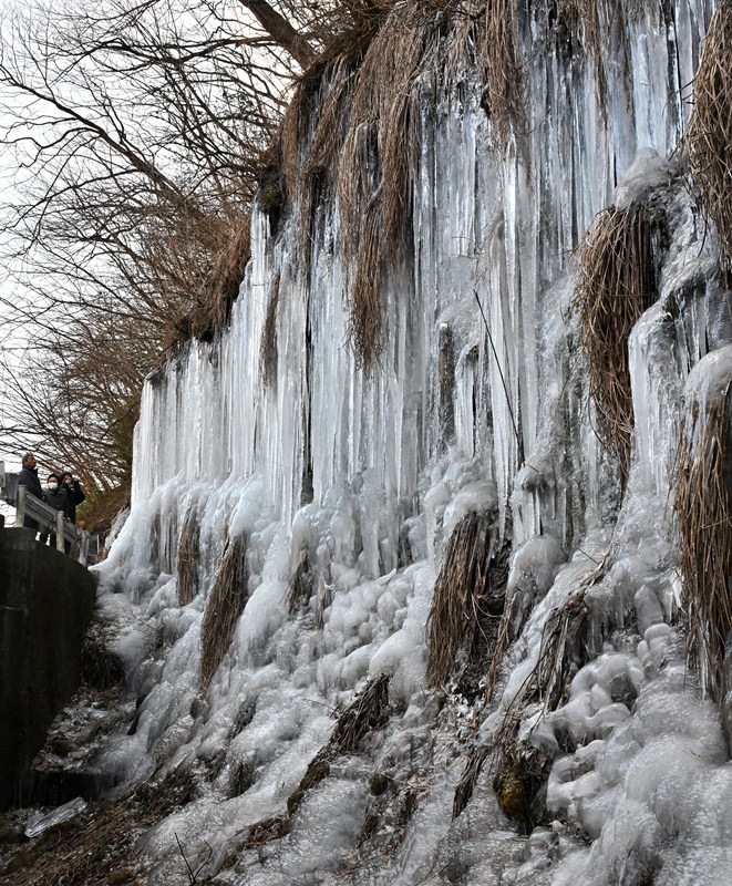群馬県桐生市黒保根町宿廻を流れる深沢川の崖沿いに氷柱のカーテンが出現した。厳冬が生み出す自然の芸術が、訪れた人を魅了している=写真。