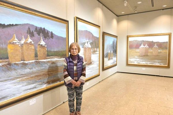 茨城県大子町の冬の風物詩「わらぼっち」を30年近く描き続けてきた同町在住の洋画家、武石絹枝さん(89)の卒寿を記念した個展が、同県水戸市三の丸の常陽芸文プラザで開かれている。雪景色にたたずむわらぼっちや川面のシガ(氷花)などを描いた郷愁を誘う油彩画18点が飾られている。同展は13日まで。日・月休館。