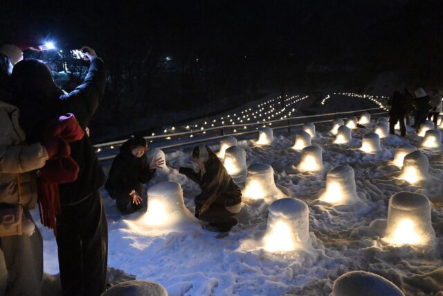 湯西川温泉街の冬の風物詩「かまくら祭」が開幕。沢口河川敷のミニかまくらのライトアップ(金~日曜)をメインに、雪遊びや温泉、飲食なども楽しめる。