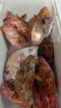 今日は若林船長もさおを出す。底が岩礁のポイントで小魚を針にかけたと思った次の瞬間、ヒラマサと思われる大物がヒット! ビュービュー糸を出して大暴れ。しかしこれも逃げられる。逃げられ病は船長にも伝染するらしい。しかしカサゴの釣果には恵まれた。