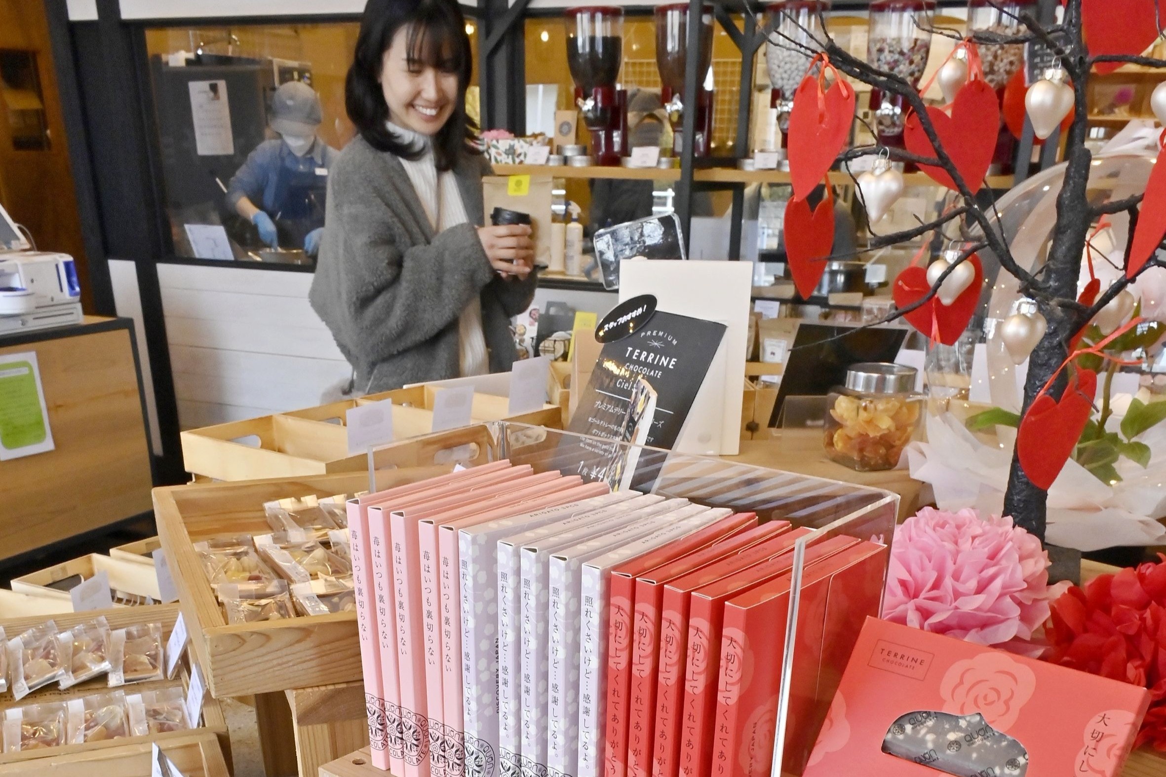 お買い物スイーツ栃木食・グルメバレンタインデーで賑わい 宇都宮市のチョコレート専門店には150種ずらり、華やかに下野新聞2026年2月12日2月14日のバレンタインデーを控え、栃木県内の専門店や百貨店は贈り物のチョコレートを買い求める客などでにぎわっている。宇都宮市桜2丁目の専門店「久遠チョコレート」には、手作りした150種のチョコレートが並ぶ。10日は朝から途切れなく女性客が訪れ、「大切にしてくれてありがとう」といったメッセージ入りの贈り物のほか、自分用にアイスクリームやドリンクなどを熟慮して選ぶ姿が見られた。久遠チョコレートは愛知県発祥。障害者の雇用機会創出のため全国に41店を構え、2021年開業の宇都宮店は知的や身体などの障害者18人が従事している。関連ニュース 甘さ控えた大人のケーキ Su-Cheri(シュシェリ)(泉町)佐藤恭子さん(47) 優しい甘さたっぷりと あんぱん あん小屋大田原店 ほのかな塩味に上品さ 豆大福 餅屋 後を引くふわふわ食感 どら焼き「つぶしあん」 本気の猿Majizaru(小山) 地図を開く 近くのニュース