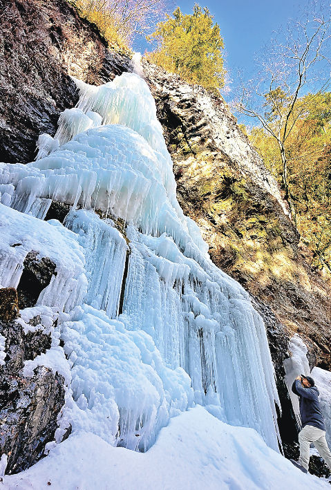 群馬県上野村楢原にある「中止の滝」が凍り、淡い青色を帯びた無数のつららが連なった巨大な氷瀑が出現している=写真。