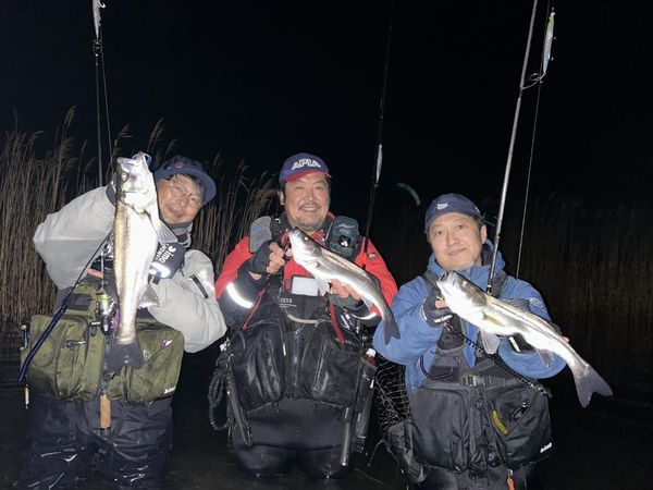 今回のようなウエーディングの場合は単独行は控え、フローティングベスト、エイガードを装着し安全を確保できる立ち位置で臨みたい。釣り始めはどうなることかと緊張したが、予想通りの展開になりほっと胸をなで下ろした。身を切る寒さだったが、気持ちは熱い夜を楽しめた。(利根川ハイプレッシャーズ・村山栄宏)