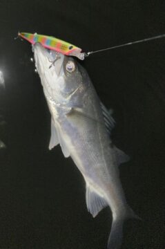 ということで、メインルアーはバチに合わせてアイマ・フルート138Fを選択。細身のフローティングタイプで独特なリップ形状から、バチに交じって水面直下10センチを狙える。泳ぎは微弱なロールアクションで大バチに偏食しているシーバスには特効のルアーだ。