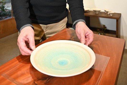 畠山さんは黒川で遊んだ少年期の原体験を基に「水の情景」をイメージした陶器制作を続けている。個展では約60点を展示し、ドラマ終盤に登場した皿を初めて公開する。