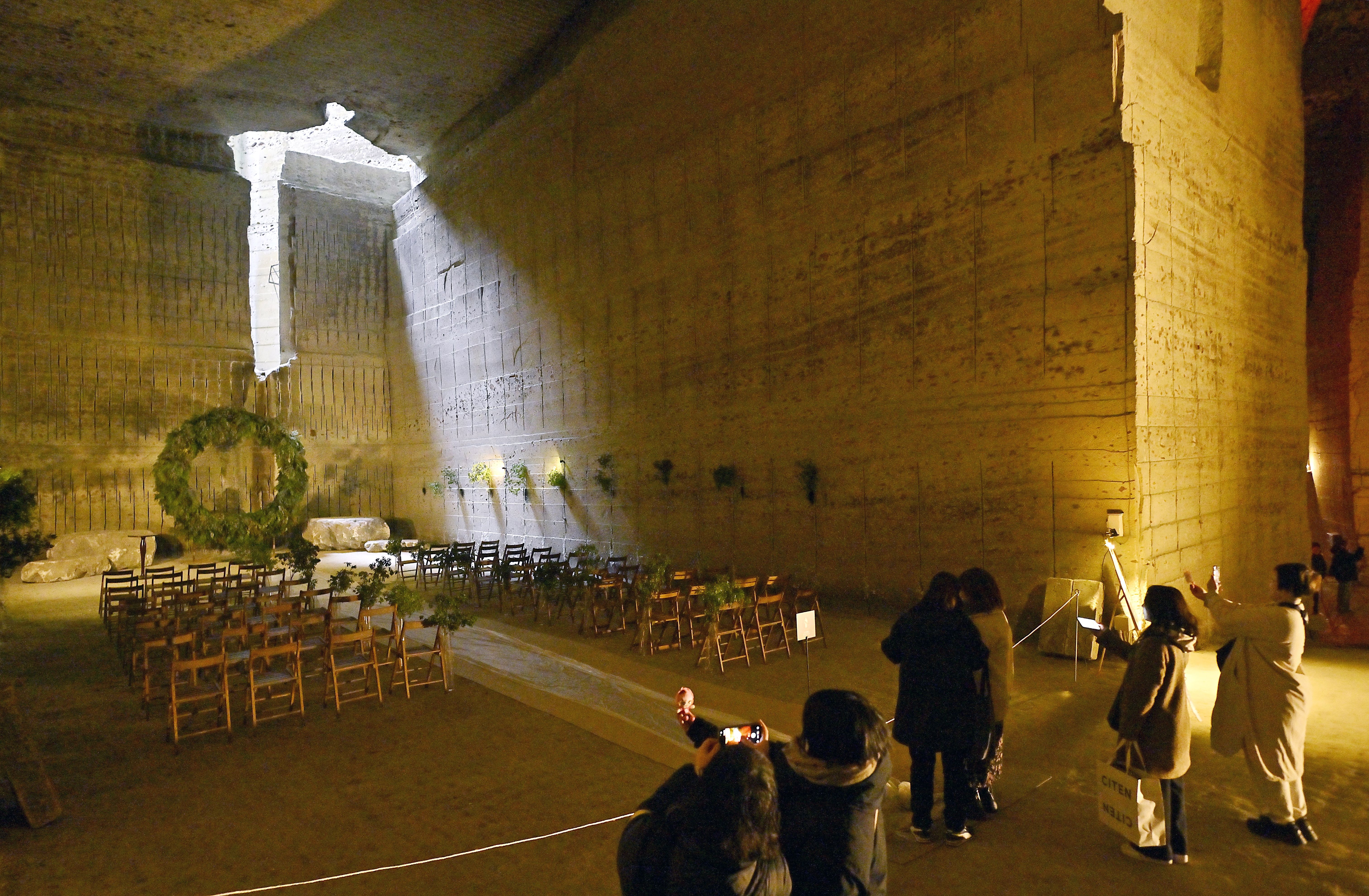 最深部のエリアが公開されるのは約2年ぶり。岩の間から差し込む光が特徴的な空間で、教会のように椅子が並べられ、草花などで装飾が施されている。