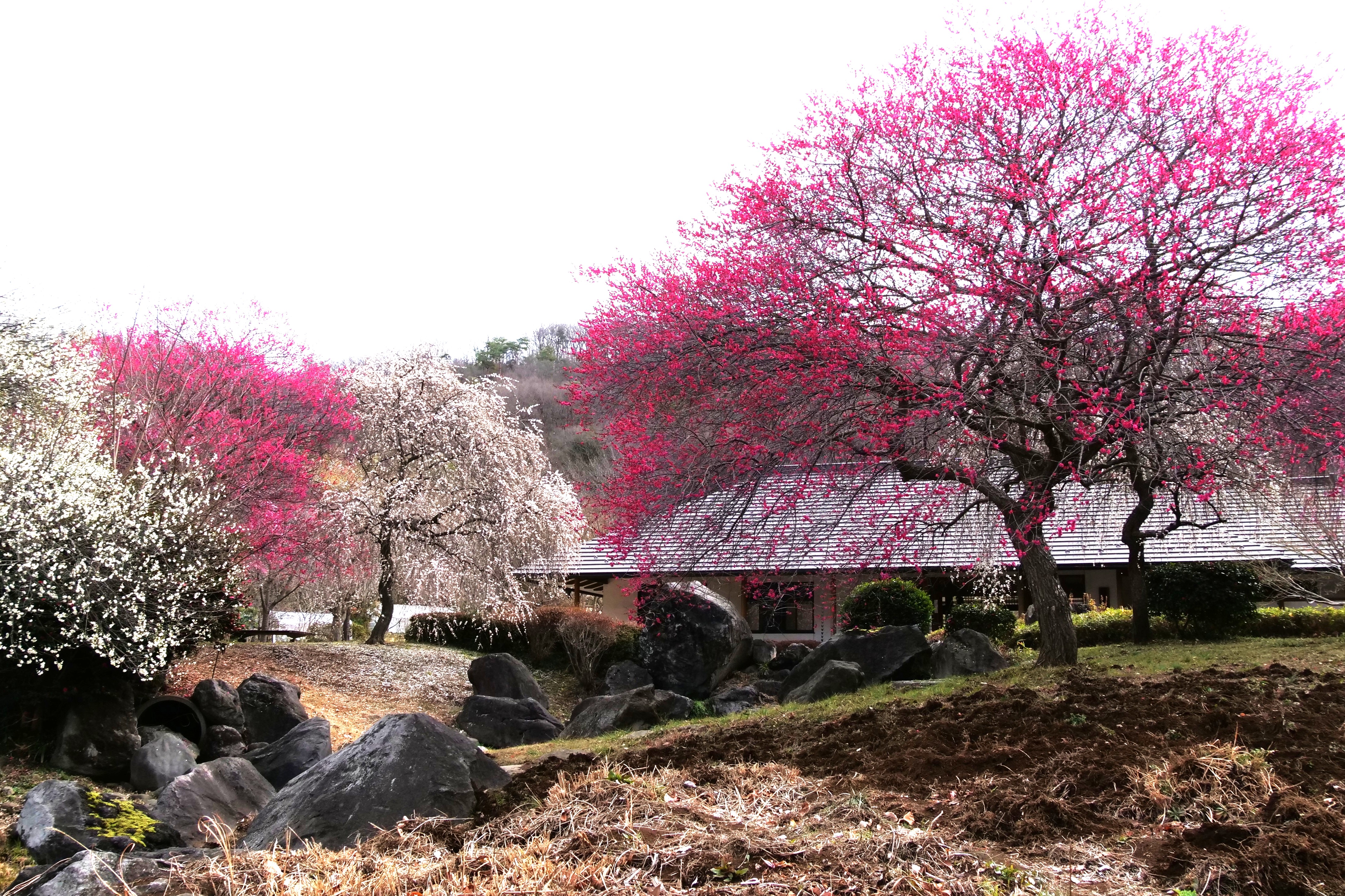一つ目は、唐沢山の東側の麓に位置する梅林公園。ひっそりとした里山に、紅白あわせて200本以上の梅の木が植えられています。