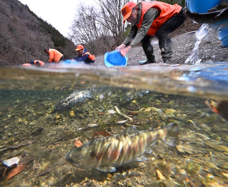 春の訪れを告げる渓流釣りの解禁(3月1日)を前に、群馬県上野村を流れる神流川でヤマメの放流が行われ、バケツから放たれた成魚が清流を力強く泳ぎ回った=写真。