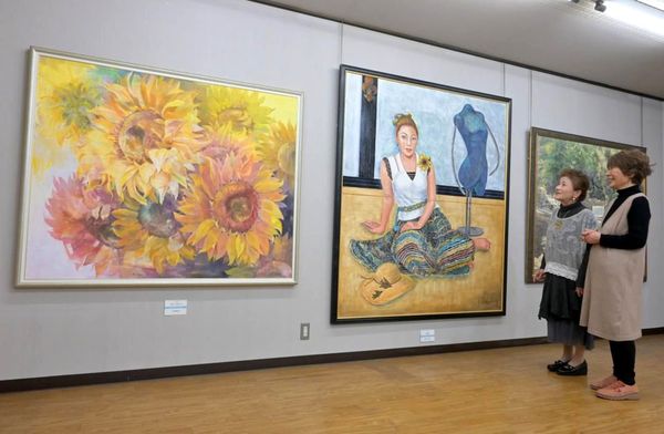 副支部長の深作八重子さんは「初夏」と「緑のイヤリング」の2点を出品。大作の初夏は、優雅なひとときを感じさせる女性と衣服の陳列に使うトルソーをバランス良く配置。女性の左肩に描いた造花のヒマワリが愛らしさを強調する。
