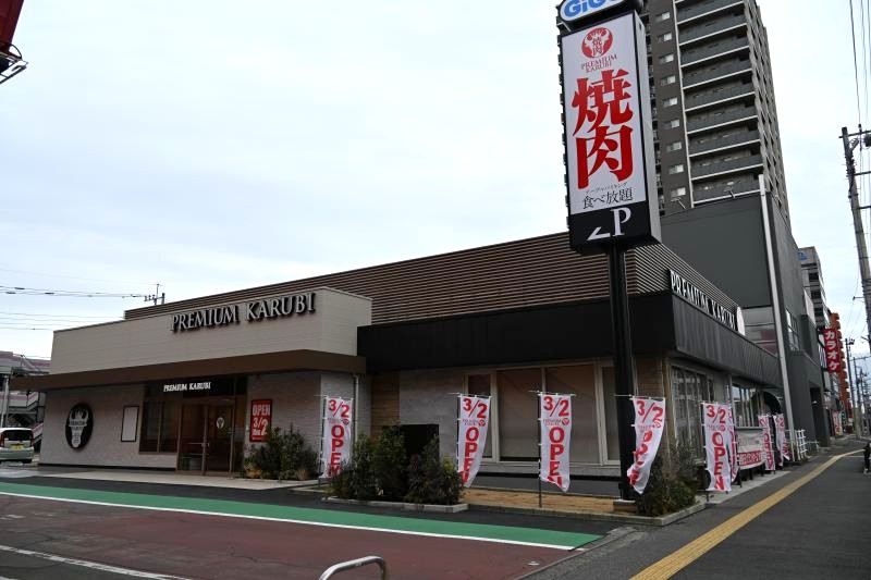宇都宮駅東店は、プレミアムカルビのフランチャイズ1号店。出店場所はLRTの駅東公園前停留場から東に約100mで、スポーツ観戦帰りなどの集客を見込む。店舗はカンセキの事務所跡に整備し、延べ床面積は358㎡。席数は136席。