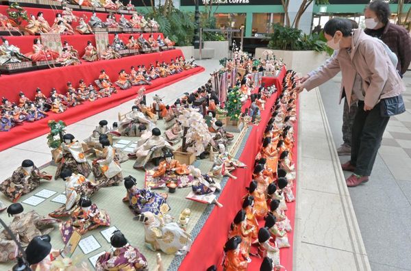 茨城県神栖市大野原のアートホテル鹿島セントラルの大階段や1階のモールエリアに、計約1000体のひな人形が飾られている。近隣住民や利用客は写真を撮影しながら春の気分を味わっている。展示は22日まで。