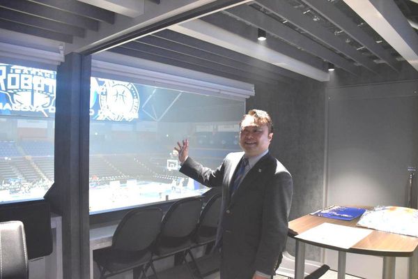 茨城県水戸市緑町のアダストリアみとアリーナ(東町運動公園体育館)を本拠地とするバスケットボールBリーグ1部(B1)の茨城ロボッツは7日、アリーナに新設されたスイートルームと一般席よりもゆったりとした「ラウンジシート」の利用者専用の新エリア「ホスピタリティエリア」の運用を始めた。8日に報道陣に公開し、ロボッツの川崎篤之社長が案内した。