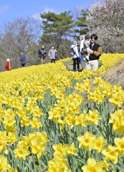 スイセンの品種は「タマラ」で、ラッパのような形をした大きな花が特徴だ。8日は青空の下、多くの家族連れなどが記念撮影を楽しんでいた。
