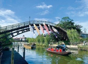 約100匹の鯉のぼりを橋に吊るし、その下をろ舟に乗って巡る潮来情緒を楽しめるイベント。ゆったりと流れる時間を楽しめる。