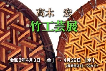古来より竹は、そのすぐれた特性により建築資材として、また農・漁業と生活全般に役立ってきた。本展では、ざる・かご等30点を展示販売する。