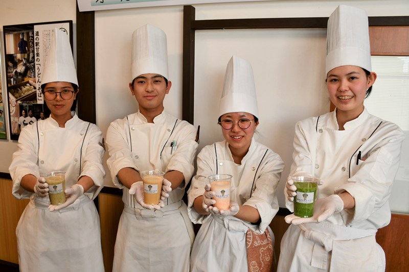 町が2023年に行った「オーガニックビレッジ宣言」を踏まえ 、道の駅甘楽が東日本調理師専門学校(高崎市)に開発を依頼。専門学校の青木茂治校長と学生4人が「地元の恵みをそのまま飲む」をコンセプトに、1月から試作を繰り返してきた。