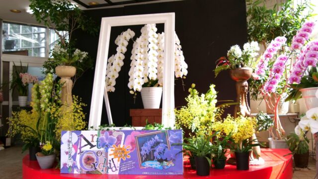 約30種100株の洋ランとアート作品の融合をテーマとした展示で、さまざまな見方で洋ランの美しさを楽しめる。