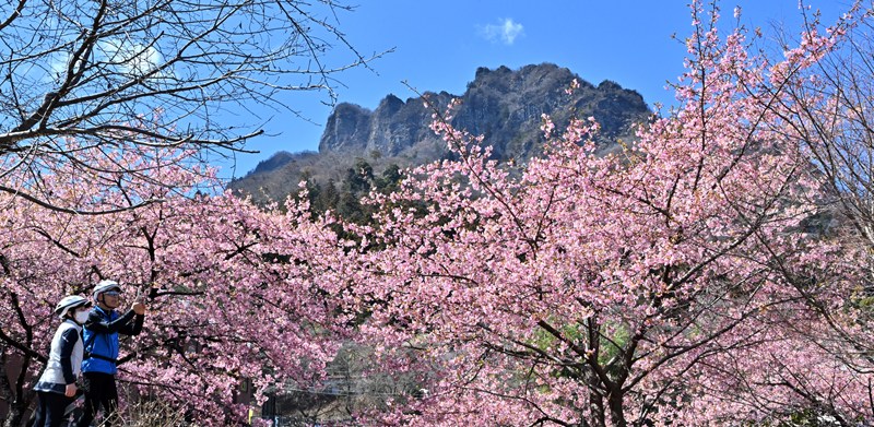 道の駅みょうぎ(群馬県富岡市妙義町)周辺のカワヅザクラが見頃を迎えた。黒くそびえる妙義山とピンクの花が鮮やかなコントラストを生み出し、観光客やアマチュアカメラマンが遊歩道から絶景を楽しんでいる=写真