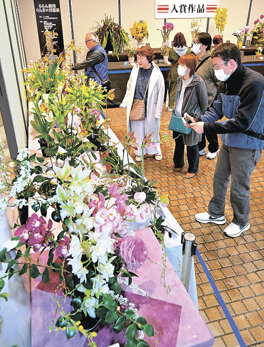 第19回ららん藤岡ぐんまの洋蘭展(実行委主催)が20日、群馬県藤岡市の道の駅ららん藤岡で始まった。県内外の愛好家や農家が丹精した242点が会場を彩り、来場者が見入っている=写真。29日まで。