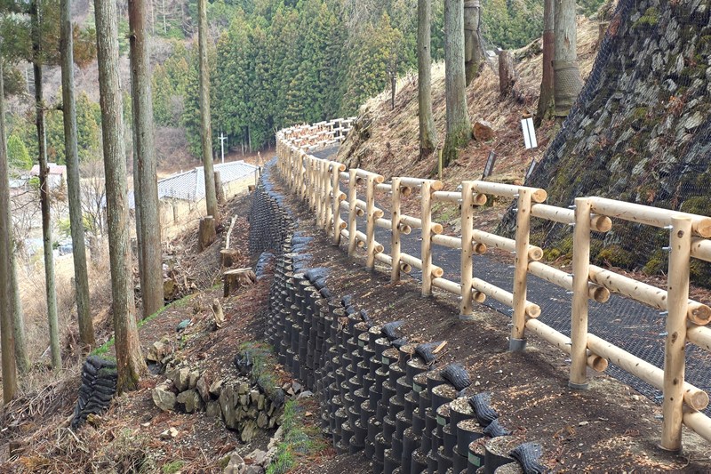 ハニカム構造の樹脂の枠に砕石を詰め、曲げたり段状に重ねたりして地形の輪郭を造った。水はけも向上。後に草が生えて自然な見た目になるという。