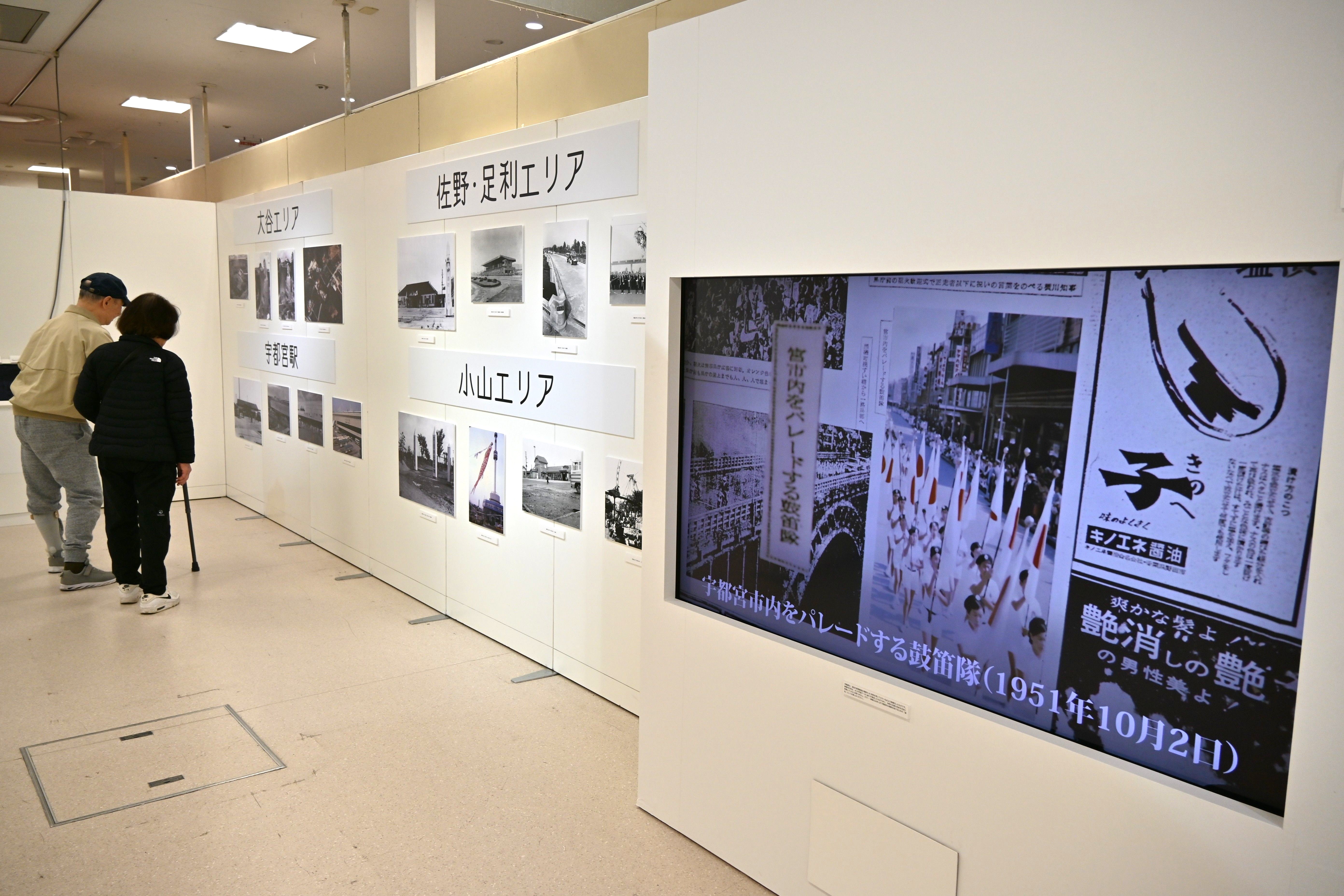 会場には、戦後間もないころの宇都宮市の大通りや二荒山神社など、宇都宮市を中心に県内各地の風景や大きなニュースの写真約70点が並ぶ。号外や昭和初期のカラー広告も展示している。
