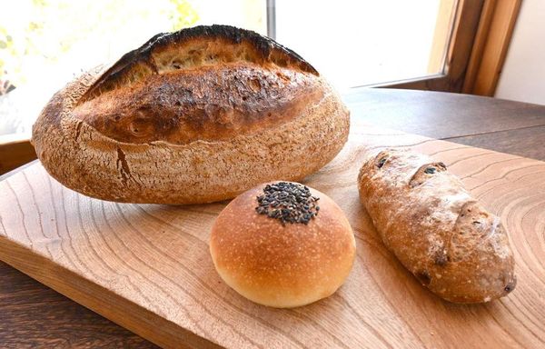 「口溶けよく」をパン作りの軸に据え、水分を多く加えたもちもちの食感が特長。品数を絞り、一つ一つの質が高いパン作りを目指している。中でも、健輔さんが「ぜひ一度挑戦してみてほしい」と力を込めるのが「カンパーニュ」(ホール980円)=写真左。発酵だけで半日とじっくり時間をかけて仕込み、小麦の香り高さとおいしさを引き出す。