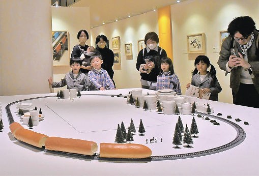 食パンの「桐生駅」を起点に、レールの上をコッペパンの新幹線が走る「新パン線」。積み重ねられた皿やカップはビルのようだ。