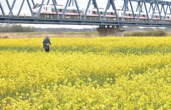 市内から家族4人で訪れた小学4年、花見知晴さん(9)は「甘いにおいが風に乗って運ばれてくる。鳥の鳴き声も心地いい」と笑顔を見せた。同県ひたちなか市中根の堀口正光さん(77)は「これだけ広い菜の花畑はなかなかない。鉄道も通るので写真撮影に良い場所」とカメラを構えた。