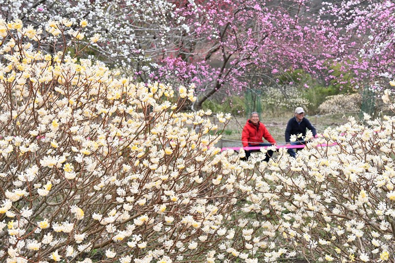 群馬県桐生市梅田町の梅田湖畔のロウバイパークに咲くミツマタ約300本が見頃を迎えた=写真。来園者は一面に広がる黄色いミツマタと、ピンクや白色の春の花々のコントラストを楽しんでいる。