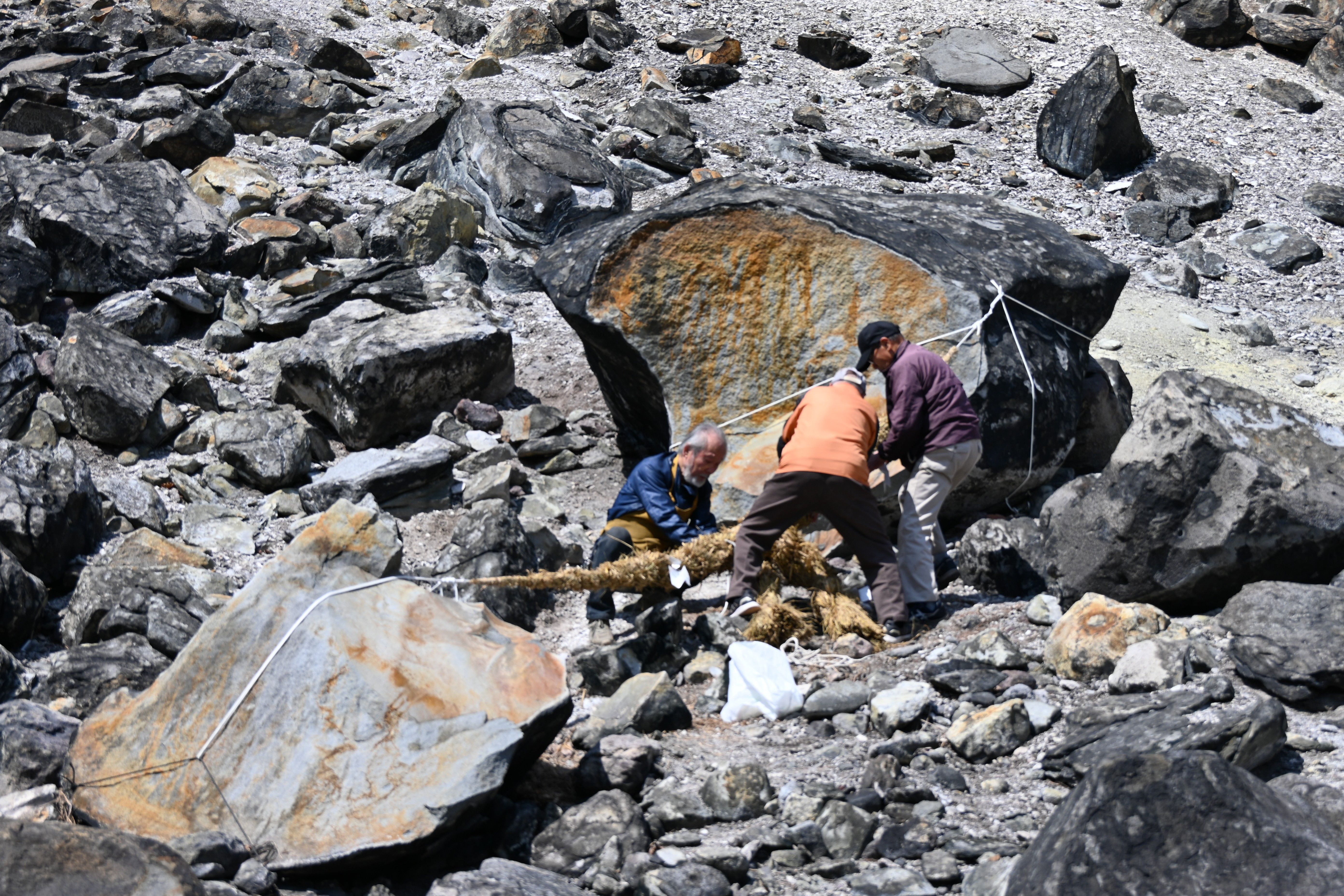 栃木県那須町の九尾の狐伝説で知られる湯本の殺生石で3日、しめ縄の交換作業が行われた。