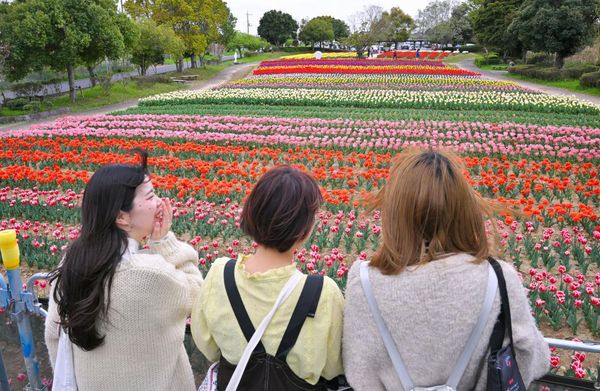 市まちづくり推進課によると、畑には約20種、11万株ほどのチューリップが植えられ、赤や黄、白、紫など、さまざまな色で彩られている。今年初めて高さ1メートルほどの観賞台が設置され、多くの人が花を見下ろしながら記念撮影。千葉県香取市から友人と訪れた鈴木晴香さん(38)は「心が温かくなって癒やされた」と笑顔で花を眺めていた。