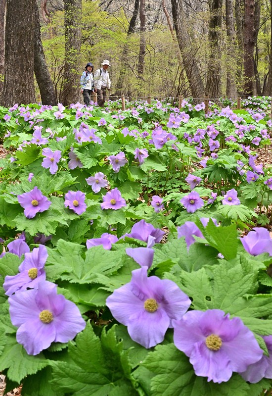 紫色のシラネアオイが咲き誇る 赤城自然園(群馬・渋川市)で群生