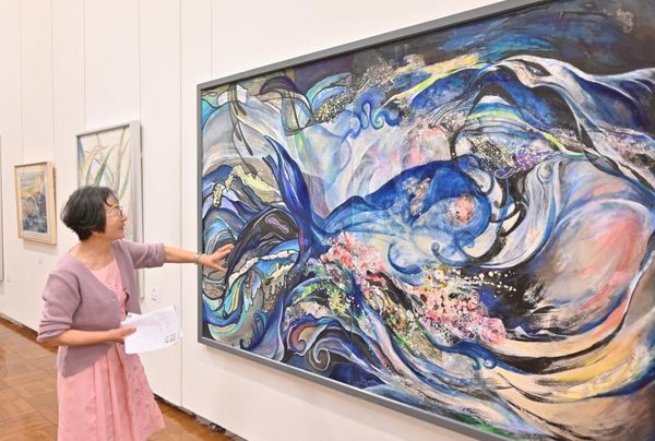 会場には、洋画や日本画、生成AI(人工知能)と油彩などを組み合わせたミクスト作品といった個性あふれる作品が並ぶ。佐々木支部長の絵画「混沌からの飛び立ち」は、コロナ禍や戦争など不安定な世の中での希望への願いを抽象画で表現した。