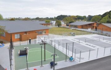 施設の外には多目的コートを3面整備。テニスと卓球を組み合わせた米国発祥の球技「ピックルボール」やフットサル、ダンスといったさまざまなスポーツを楽しめる。カフェではコーヒーや軽食、地元菓子店とコラボした干し芋パイのシェイクを提供する。