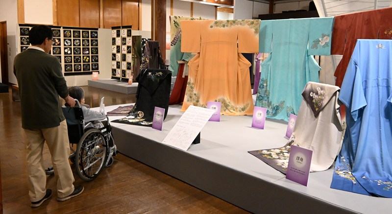 刺しゅう作家の草乃しずかさん(81)=東京都=に焦点を当てた企画展「源氏物語を花で装う」が5月31日まで、群馬県高崎市の県立日本絹の里で開かれている。源氏物語に登場する女性の心情を花の刺しゅうで表現した着物など177点が並ぶ。