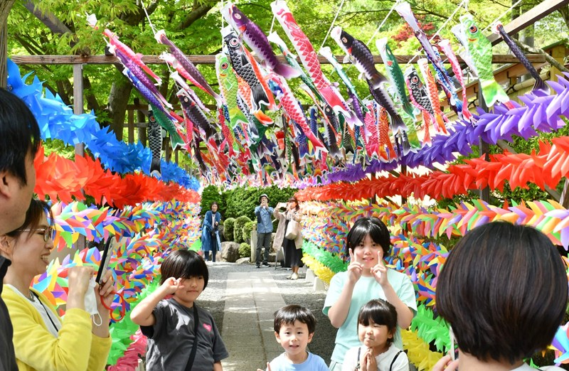 ミニこいのぼり約500匹と3000個以上の風車で参道を飾る催しが18日、群馬県桐生市川内町の宝徳寺で始まった。色鮮やかな光景に参拝客が見入っている。5月17日まで。