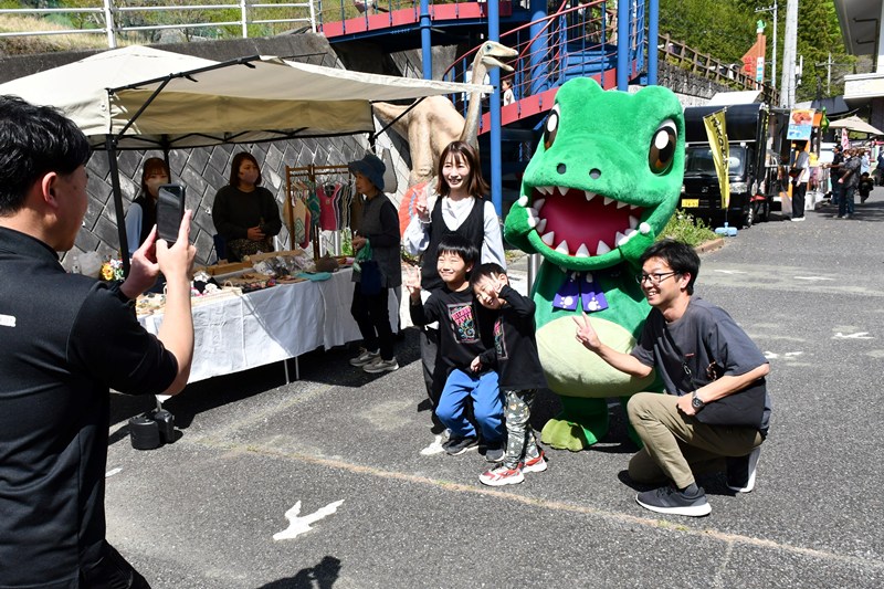 飲食やハンドメードの店が町内外から集まる「ジュラシック・マーケット」が18日、群馬県神流町の町恐竜センターで初めて開かれた。町観光大使「サウルスくん」も登場し、来場者が記念写真を撮るなどして楽しんだ=写真