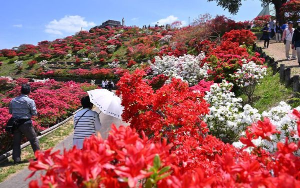 園内の25品種約8500株のツツジは早咲きから遅咲きと種類ごとに見頃を迎え、訪れた人たちは赤やオレンジの雲の間を歩くように園路を巡った。同県常陸大宮市から友人と訪れた中崎信雄さん(72)は「久しぶりに訪れたが、いろいろな色の花が美しく、改めて良い所だと再発見できた」と満足そうに話した。