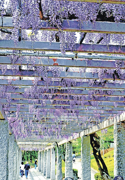 藤岡市の春の風物詩「ふじまつり」。全長約350メートルのフジ棚には、紫や白など45種類のフジが咲く。