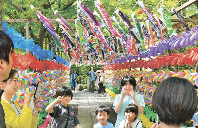 新緑の床もみじが公開されているほか、参道にはミニこいのぼり約500匹と3000個以上の風車が飾られている。