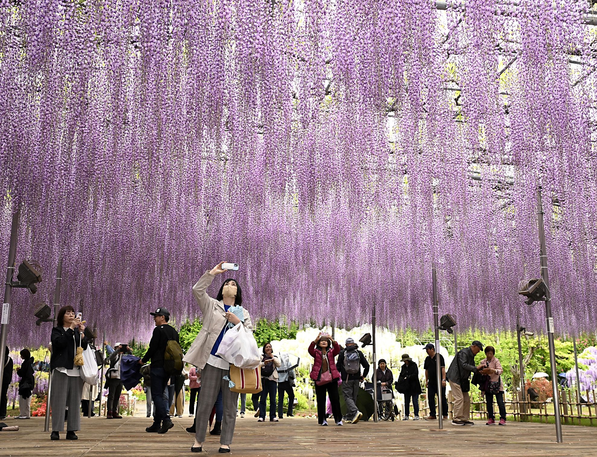 2本の大藤からなる広さ1200畳(約2000㎡)の藤棚では約16万房が満開に。時折、小雨が混じる天候となった23日も多くの人が訪れ、思い思いの場所でカメラやスマートフォンを構え、写真に収めていた。