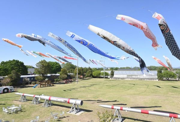 5月5日のこどもの日を前に、茨城県筑西市のテーマパーク「ザ・ヒロサワ・シティ」の乗り物エリア「ユメノバ」で、色とりどりのこいのぼり約200匹が春風に吹かれながら悠々と泳いでいる。同31日まで。