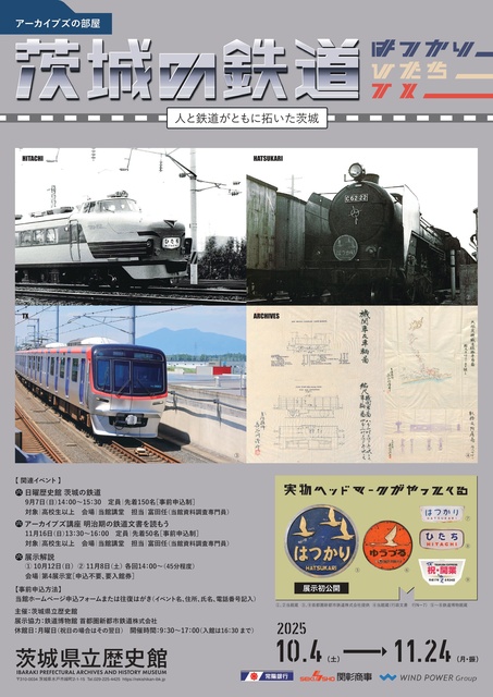 茨城県立歴史館では、アーカイブズの部屋「茨城の鉄道―はつかり、ひたち、TX―」を開催。茨城の鉄道発達の歩みを、資料をもちいて概観する。11/16(日)は、アーカイブズ講座『明治期の鉄道文書を読もう』が催される。「くずし字」を含む明治期の鉄道に関する行政文書を解読し、その内容を考える。