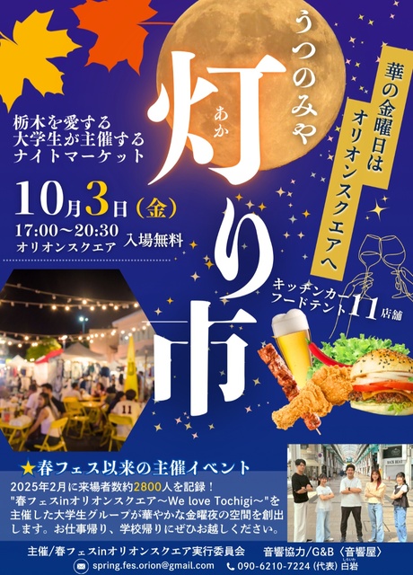 栃木を盛り上げたい!というたった1つの共通点から繋がった大学生5人がゼロから企画!今年2月には「春フェスinオリオンスクエア」を主催し、約2800人の来場者を迎えた。春フェスは日曜開催だったため、ステージライブなど家族向けの内容だったが、今回はいわゆる「華金」。仕事帰りや学校帰りの学生をターゲットに、キッチンカーなど栃木を拠点とする11店舗が大集結!この機会に立ち寄ろう。